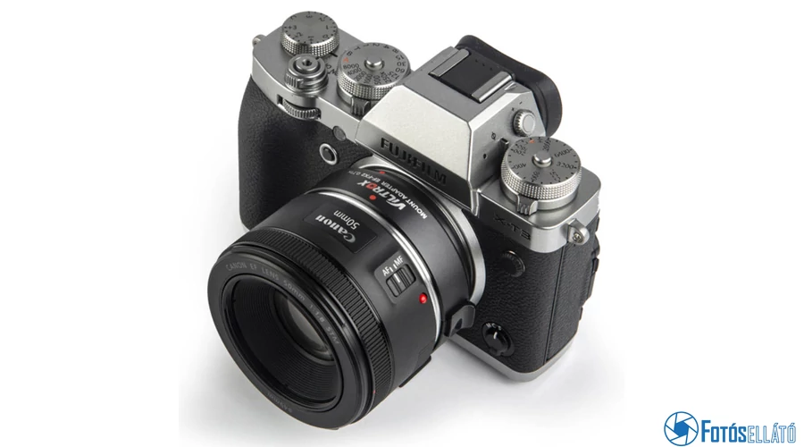 Az adapterrel Canon EF bajonetes objektíveket használhatunk Fujifilm X bajonetes gépeken. |