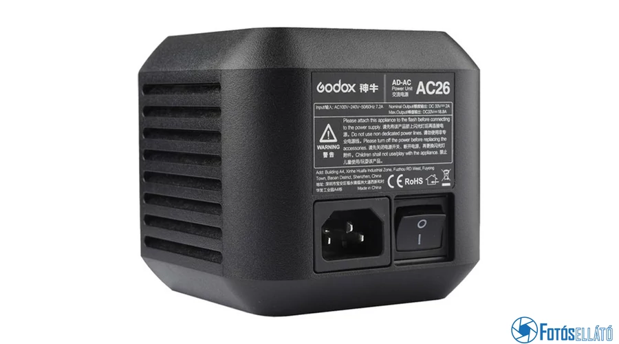 AC26 AD600PRO hálózati adapter a Godox-tól. A termék segítségével WITSTRO AD600 akkumulátoros vakufejedet hálózati erőforrásól is működtetheted.