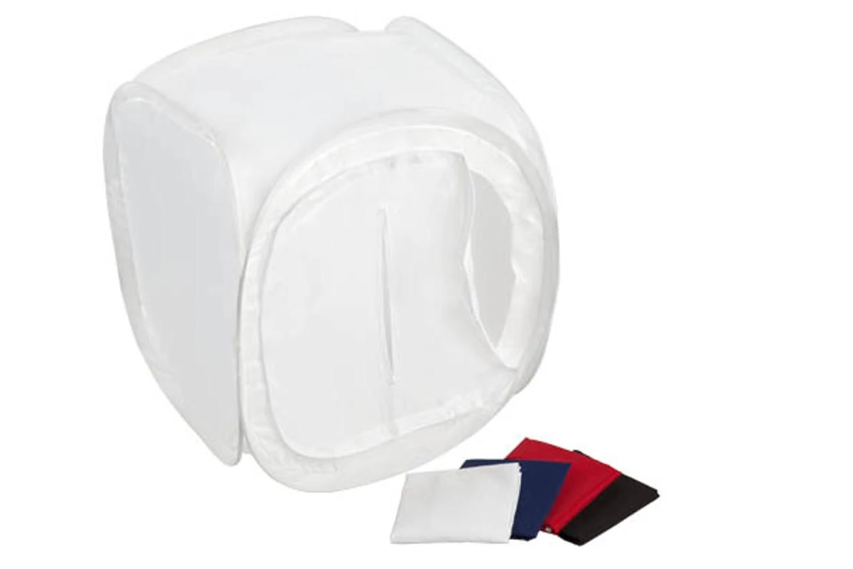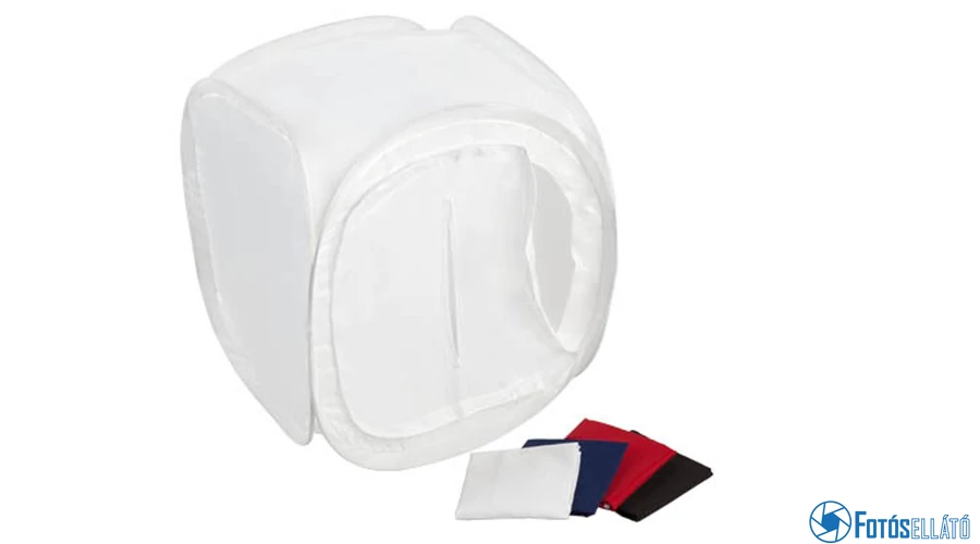 Kis méretűre összecsukható tárgyfotó sátor, diffúz anyagból készült oldalakkal. Segítségévél könnyedén csinálhatunk kiváló termékfotókat.