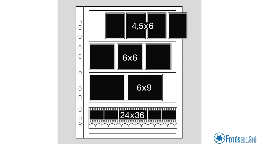 | A csíkokra vágott negatív és síkfilm lapok rendezett és védett tárolására és archiválására alkalmas tárolólap. A margón lyukakkal ellátva. | |