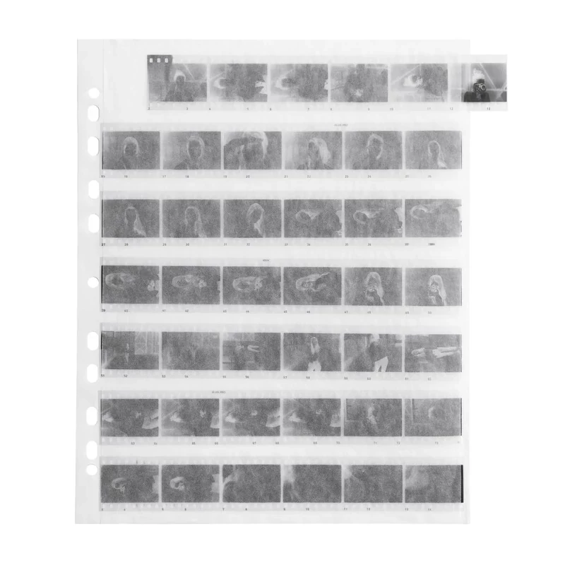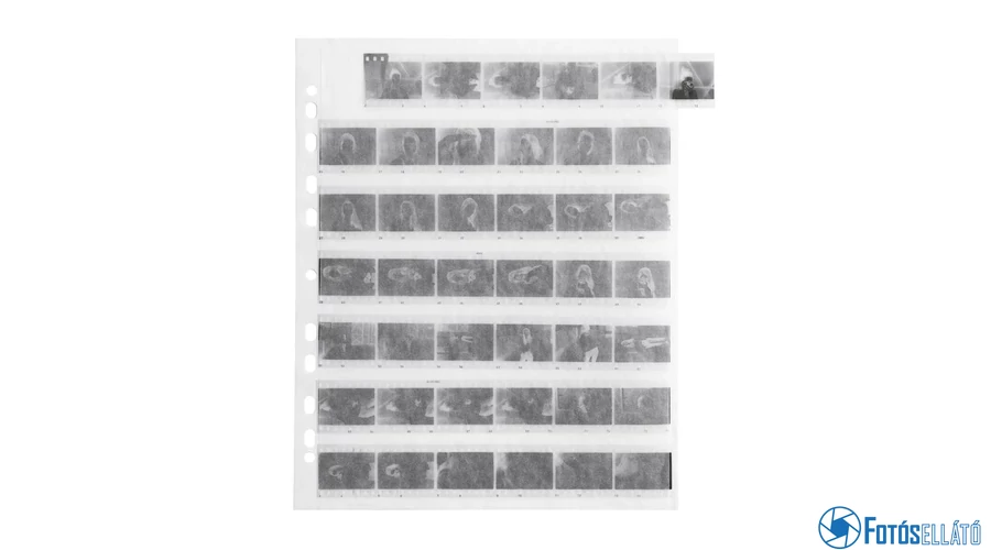 | A csíkokra vágott negatív és síkfilm lapok rendezett és védett tárolására és archiválására alkalmas tárolólap. A margón lyukakkal ellátva. | |