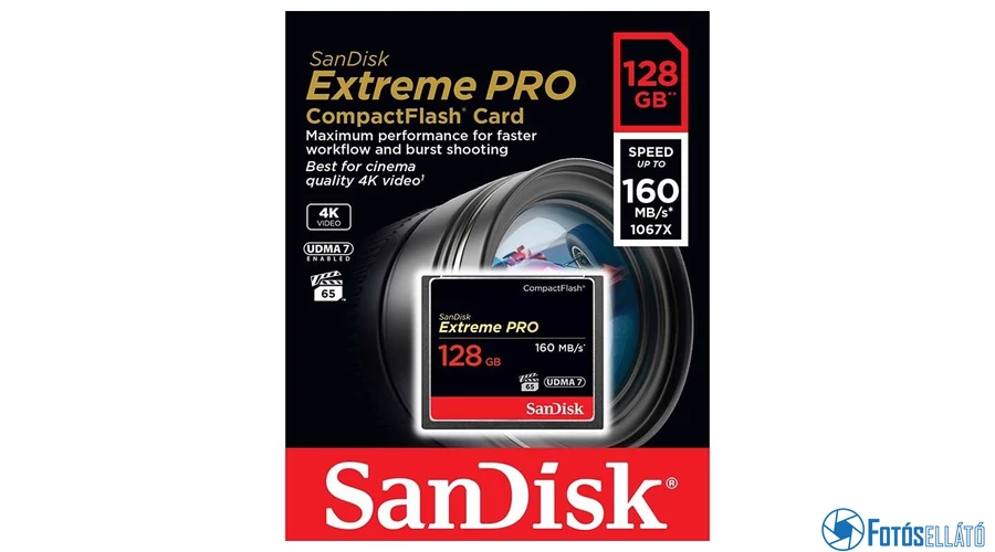 A SanDisk Compact Flash Extreme Pro cserélhető médium kifejezetten a CompactFlash I és II interfészekkel ellátott professzionális digitális tükörreflexes fényképezőgépekhez alkalmas. A VPG-65 specifikációnak felel meg, amely lehetővé teszi a 4K felbontású videó ultra gyors adatáramát. A kártya vízlepergető anyagból készül, ellenáll a rezgésnek és rázkódásnak, így hordhatja a nadrágzsebében is anélkül, hogy aggódnia kellene az adatai miatt. A memória eszköz visszafelé kompatibilis az UDMA 7 interfésszel.
