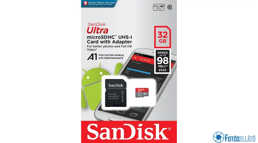 SanDisk 32GB microSDHC™ Mobile Ultra™ memóriakártya, + adapter, (120/10MB/s) class 10, A1 + Android APP