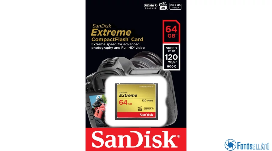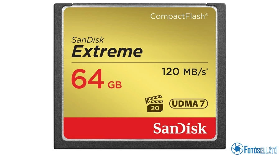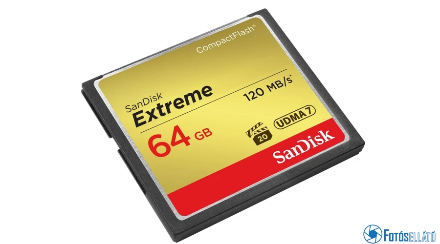 A SanDisk Compact Flash Extreme adathordozó elsősorban a CompactFlash I/II felülettel rendelkező legújabb digitális fényképezőgépek és kamerák részére ajánlott. VPG-20 specifikációjú, aminek köszönhetően a Full HD (1920 × 1080) videó adatmennyiségét is győzni tudja. Vízálló anyagból készült, rezgés- és ütésálló, így még a nadrágzsebben is hordozható, és nem kell attól tartani, hogy elvesznek az adatok. A memóriakártya visszafelé UDMA 7 kompatibilis.