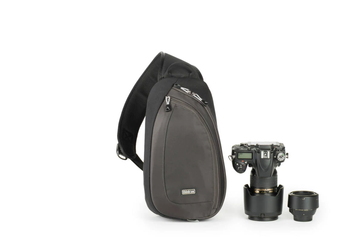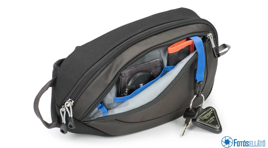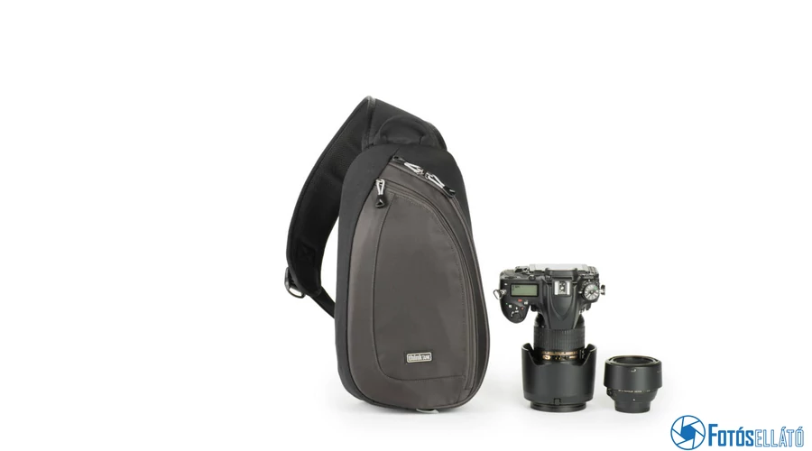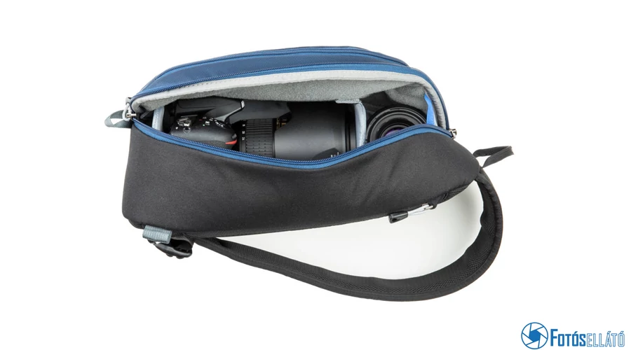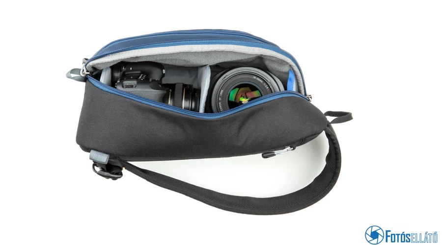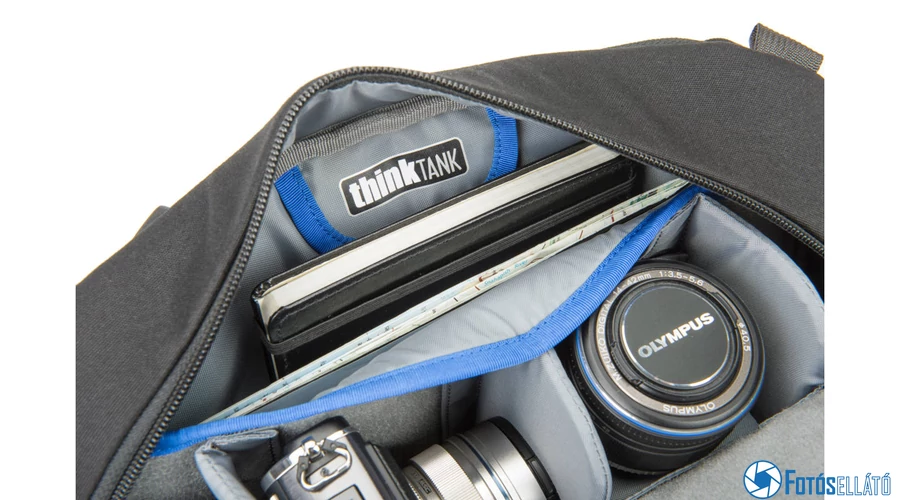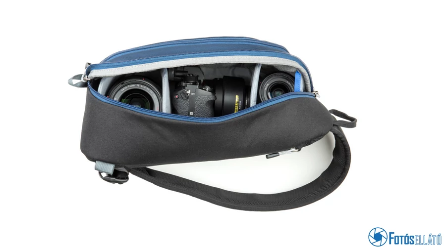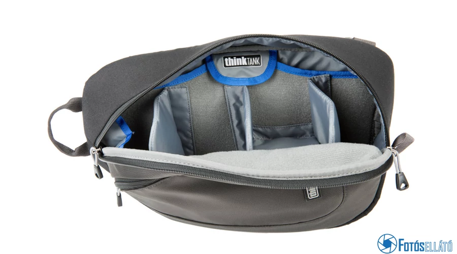 A Think Tank Photo TurnStyle 10 V2.0 hordozható táska vízálló, 1 DSLR-t három lencsével és kiegészítőivel tudja tárolni. Ezenkívül egy kicsi, 8 "-es tabletet is tárolhatunk benne egy speciálisan párnázott, cipzárral ellátott külső zsebében, a táska hátulján. A kiegészítők tárolásához a heveder egészében zsebek vannak.