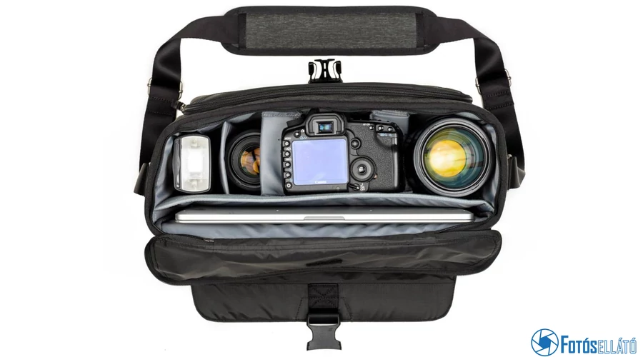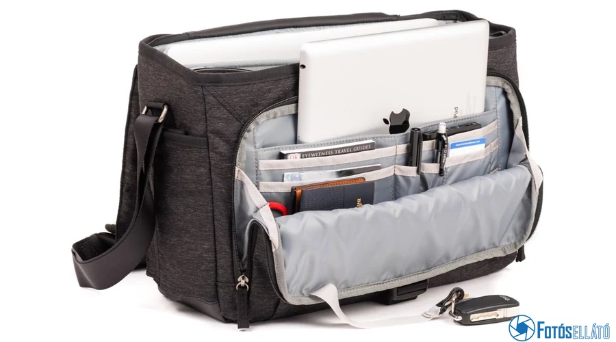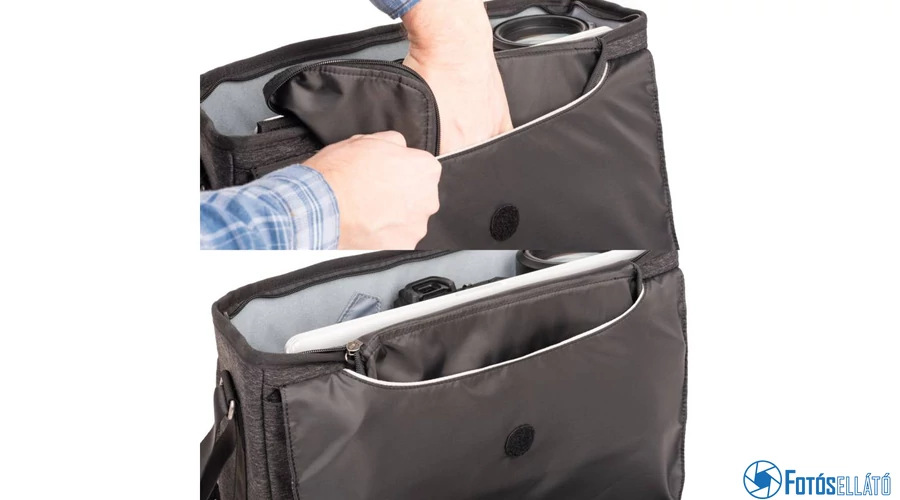 Amellett, hogy a fotóeszközöket laptopokkal együtt is tartja, a cipzáras előlapon belül több zsebbel is rendelkezik, amelyek tollak, névjegykártyák, hordozható akkumulátorok, memóriakártya pénztárcák, nagyképernyős mobil eszköz és 10 hüvelykes tablet tárolására szolgálnak.